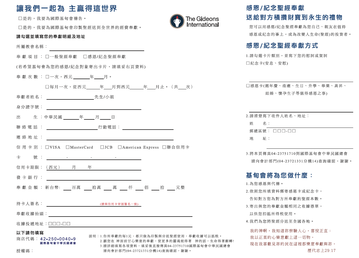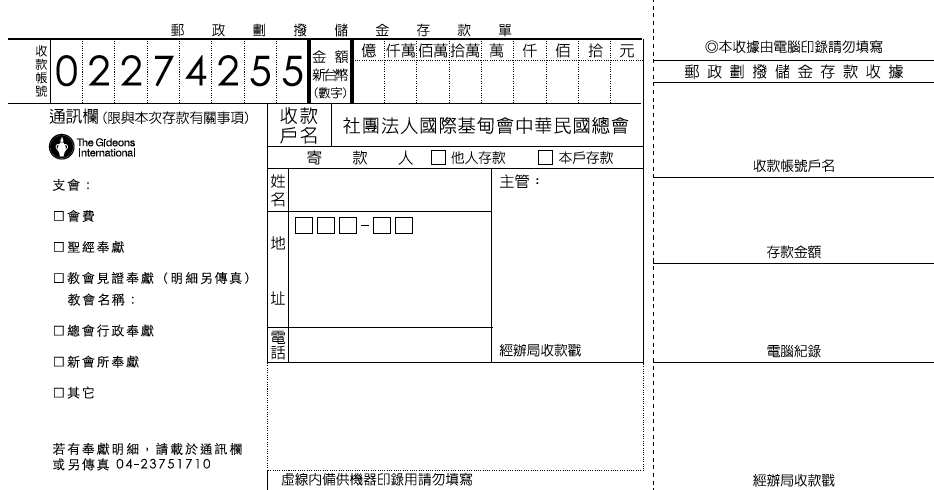 戶名:社團法人國際基甸會中華民國總會
